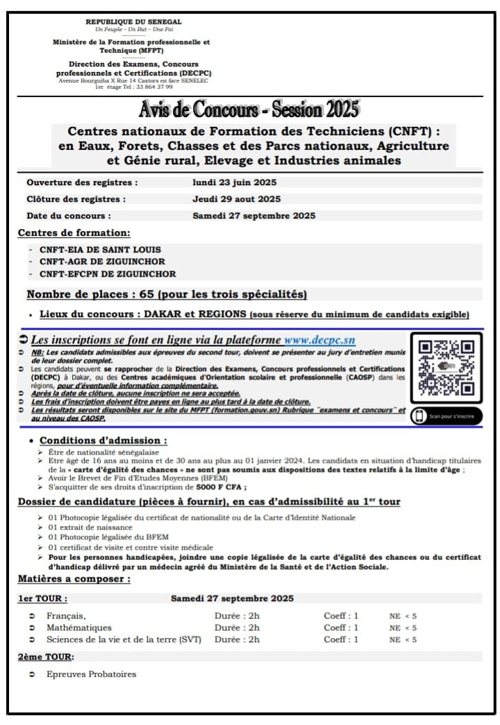 Les inscriptions se font dans les centres CNFT de Ziguinchor (Eaux, Forêts, Chasse et Parcs), Saint‑Louis (Agriculture & Élevage) et d’autres délégations adaptées :contentReference[oaicite:4]{index=4}. Chaque centre propose des spécialités qui influencent la nature des épreuves pratiques, choisis selon tes atouts.